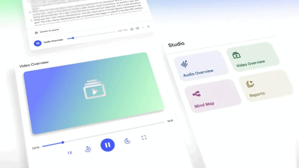 قابلیت Video Overviews در واقع یک ابزار هوش مصنوعی پیشرفته است که به کاربران امکان میدهد انواع یادداشتها، اسلایدها، نمودارها و فایلهای درسی را به ویدیوهای خلاصه و قابل فهم با صدای طبیعی هوش مصنوعی تبدیل کنند.